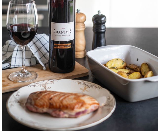 Le Brennus Rouge AOP Bergerac révèle de belles notes de fruits noirs et d’épices. Son équilibre accompagne parfaitement la puissance du magret et la rondeur du jus au poivre.