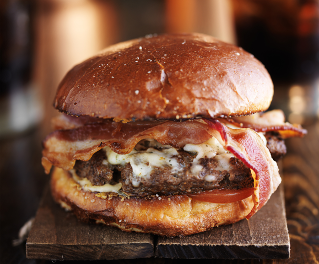 - Assemblez avec pain brioché, bacon grillé, cheddar et oignons confits.
