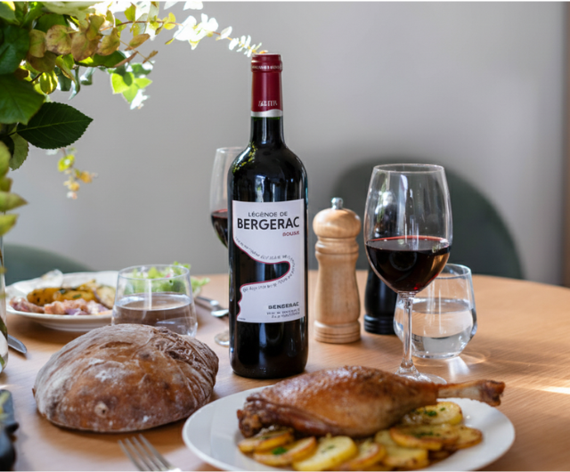 Avec ses arômes de fruits mûrs et sa finesse, Légende de Bergerac Rouge AOP Bergerac équilibre parfaitement la richesse du confit et la gourmandise des pommes sarladaises.
